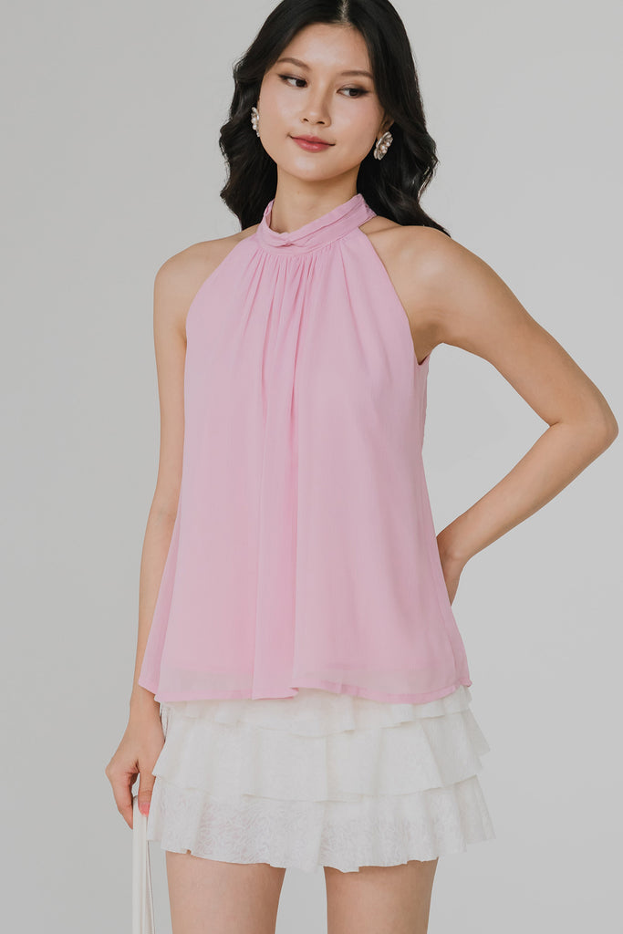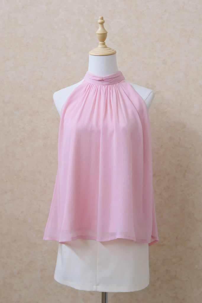 This halter top is crafted from lightweight crepe for an airy, elegant drape. Designed with a high neckline, it offers a refined silhouette, while the flowy fit creates effortless movement. A subtle keyhole back detail adds a touch of allure and modern charm. Perfect for both day and evening wear, this top pairs beautifully with tailored bottoms or relaxed separates.