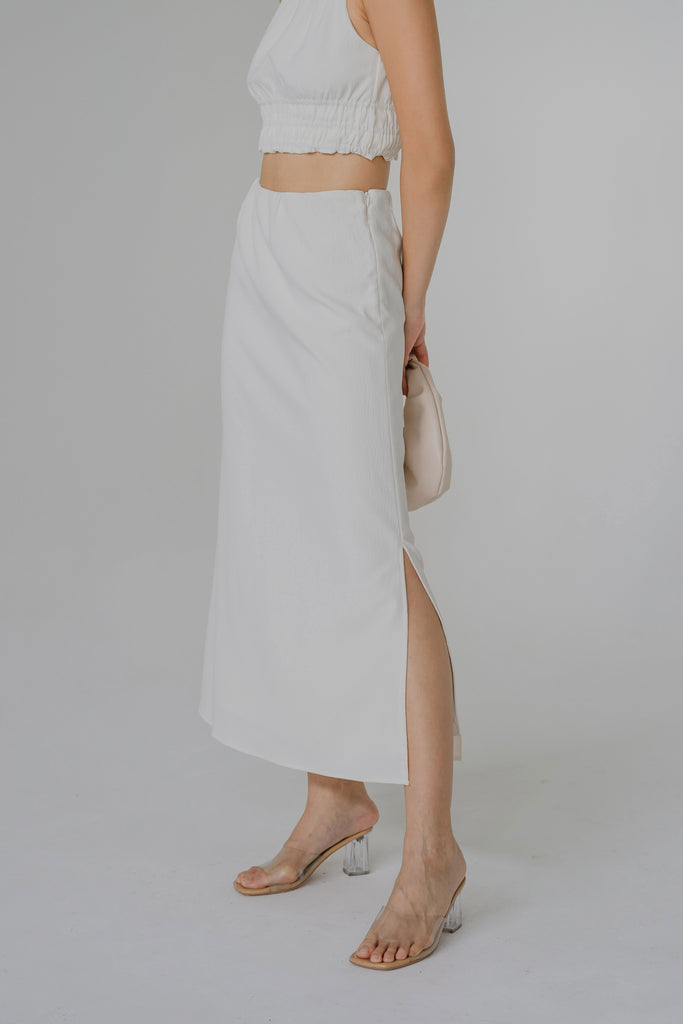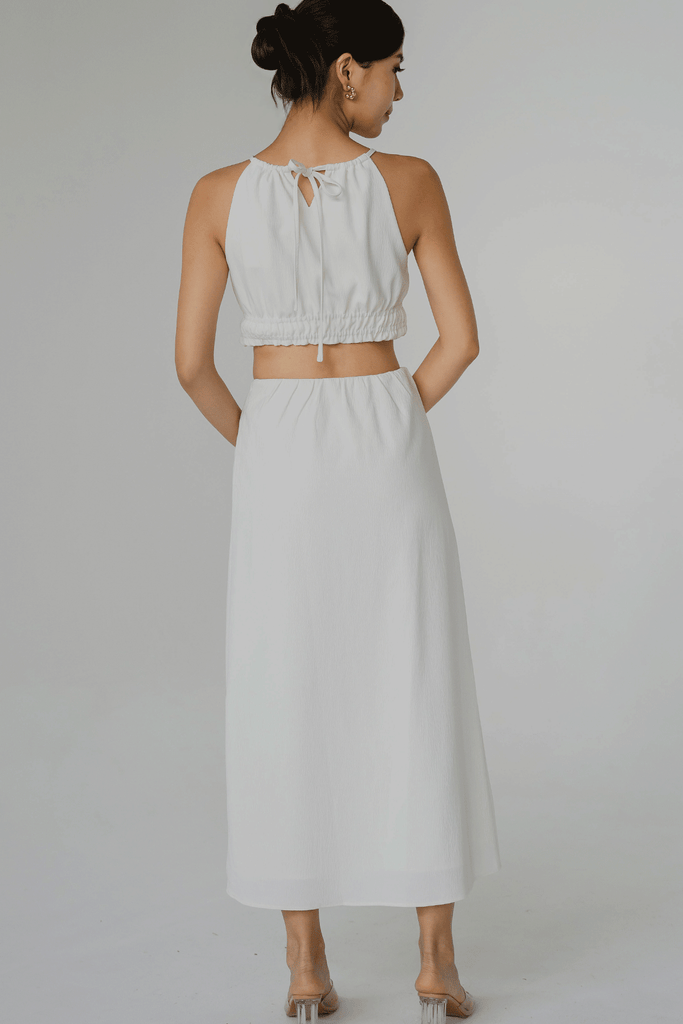 Softly structured with a romantic touch, the New Romantics Skirt is designed for both style and ease. Made from textured crepe and fully lined for comfort, it features a stretchable waistband at the back, a concealed side zipper for a seamless finish, and a side slit for effortless movement. Feminine yet functional, it’s the perfect piece to pair with the New Romantics Halter Top or your favorite blouse for an elevated everyday look.