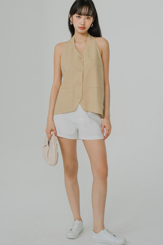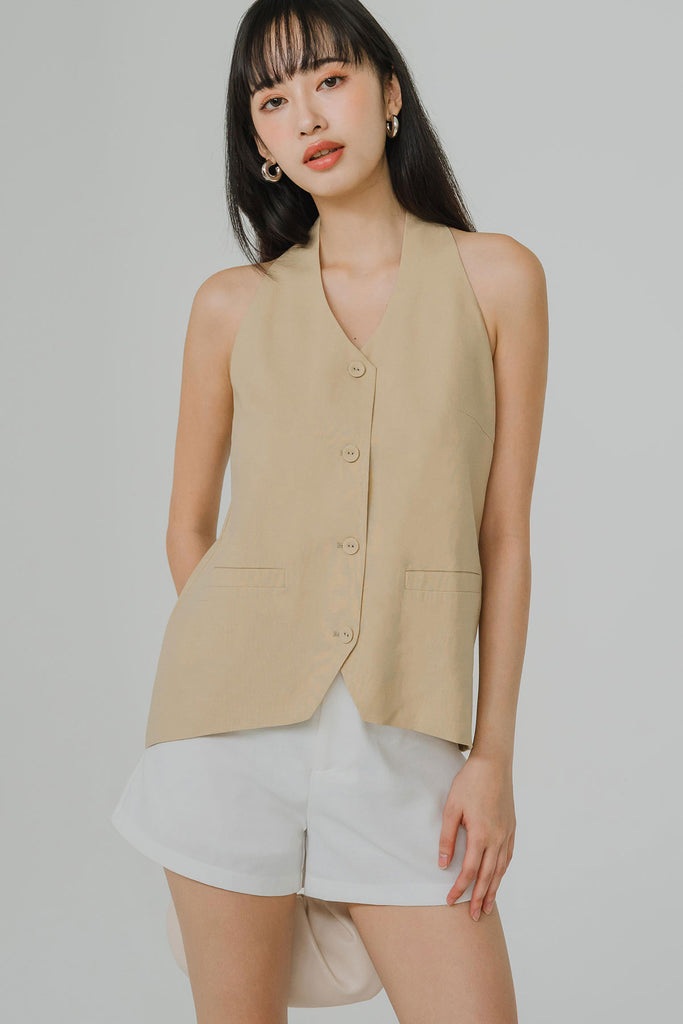 Elevate your basics with a twist. This Vera Linen Vest redefines classic tailoring with its unique halter neckline, offering a fresh alternative to your usual vest tops. Designed with functional front buttons for versatile styling and functional front pockets. Fully lined for comfort and a polished finish—perfect for dressing up or down.