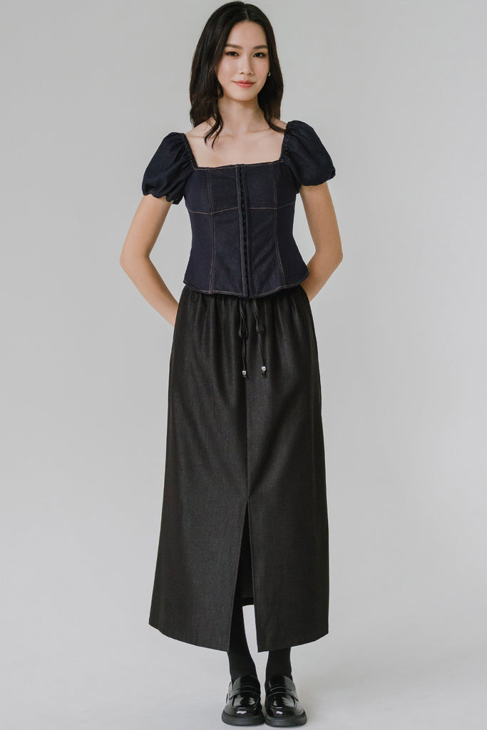 This faux-denim top blends classic texture with modern femininity. Made from cotton-blend fabric, it features voluminous puff sleeves, removable padding for adjustable support, a convenient back zipper, and a fully lined interior for polished comfort.
