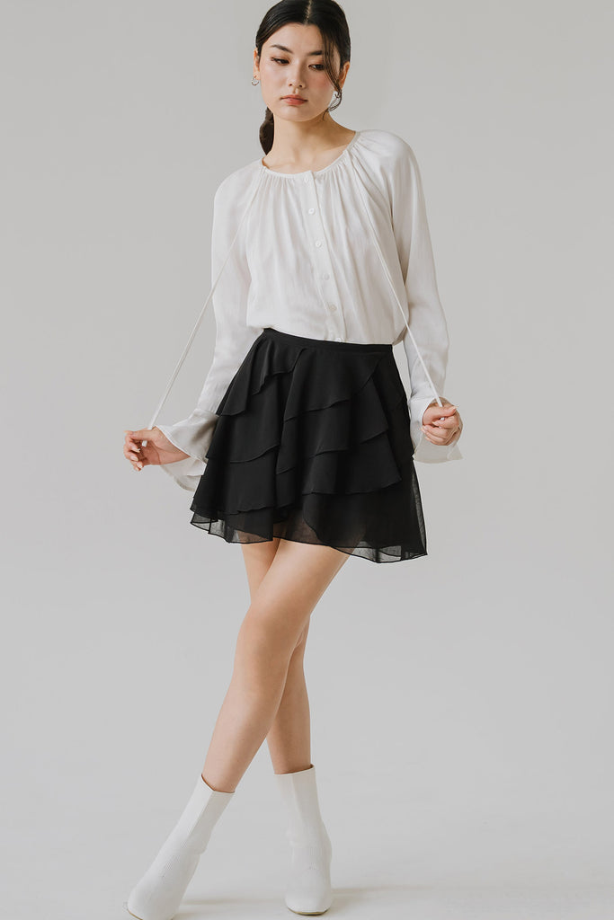 A romantic and timeless piece featuring a flowy silhouette with soft gathers along the neckline. Designed with delicate tie details that can be styled loosely or in a bow for a refined touch. Finished with button-down front and subtle flared cuffs that add graceful movement to every wear — perfect for both work and weekend ensembles.