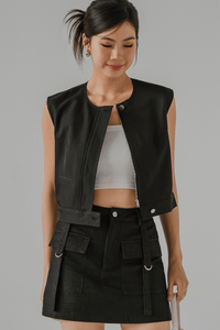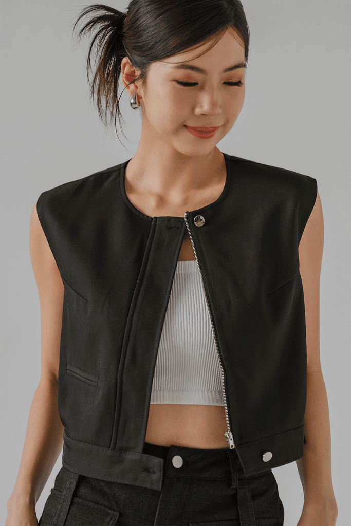 Effortlessly versatile and stylish, Odyssey Vest Top is designed with refined details to elevate your everyday look. Featuring a concealed front zip with button sleeve accents, it blends a sleek silhouette with subtle edge. Crafted from a premium rayon-polyester blend, this piece offers a soft, breathable feel with just the right amount of structure. Wear it as a standalone top or layer it as outerwear for a polished finish.