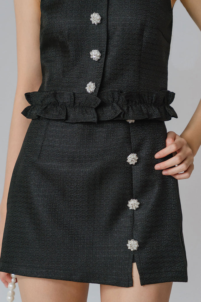 This elegant tweed top pairs timeless texture with refined detailing. Featuring a high Mandarin collar, it delivers a structured, sophisticated silhouette that elevates any look. Functional front buttons add classic charm, while the bejewelled silver buttons provide a touch of sparkle. Crafted from rich tweed fabric, the top offers both style and substance, making it perfect for dressing up tailored skirts, trousers, or coordinated sets.