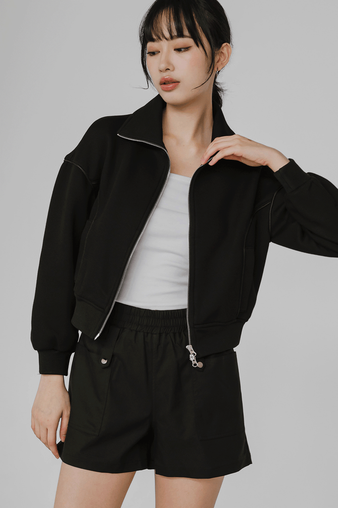 Stay cozy without sacrificing style in this cotton cropped jacket—your new go-to. Designed with warmth in mind, it features a soft, structured feel, a dual-way zipper for versatile styling, and a clean, elevated collar. Thoughtful seam detailing adds shape and polish, making it the perfect layering piece from day to night. Casual, cool, and effortlessly functional.