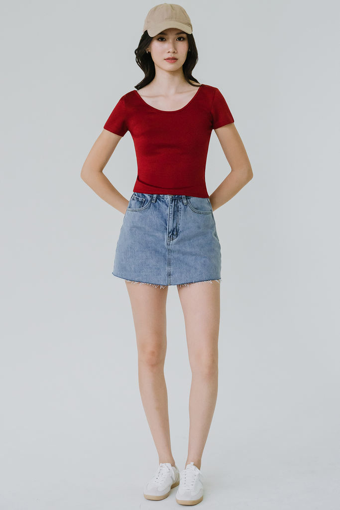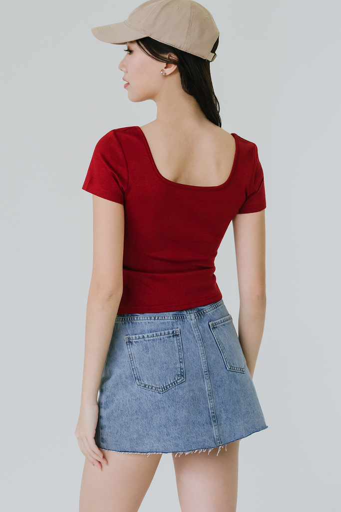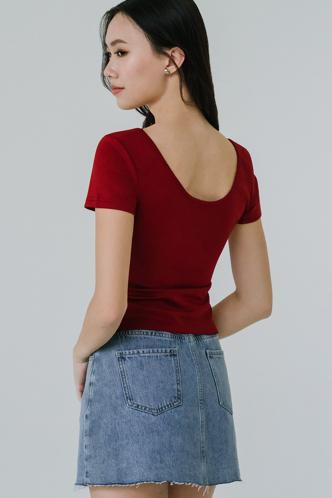 A versatile reversible tee designed for everyday wear. Features a square neckline on one side and a classic round neckline on the other. Crafted in a soft, stretchable cotton Lycra blend for a comfortable, body-hugging fit. Full-length silhouette for easy styling.