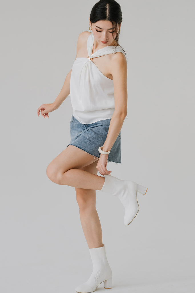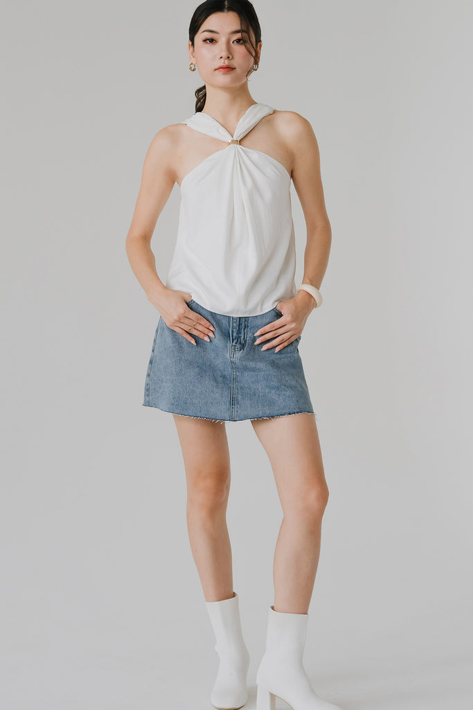Chic and sophisticated, Khalessi Halter Top is designed to make a statement. Featuring a unique gathered neckline accentuated with a sleek gold-tone hardware detail, it adds a touch of elegance to any look. The stretchable back panel ensures a comfortable and flexible fit, while the concealed back zipper allows for a seamless silhouette. Fully lined on the inside for added comfort and coverage, this piece pairs effortlessly with tailored trousers or skirts for a polished, elevated ensemble.